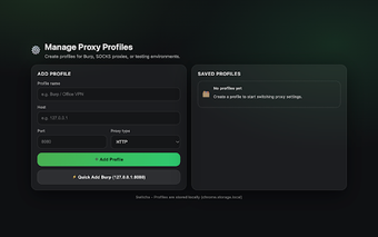 Switcha, Chrome tarayıcısı için geliştirilmiş hafif bir eklentidir. Geliştiriciler ve güvenlik test uzmanları için tasarlanmış olan bu araç, kullanıcıların proxy profilleri arasında hızlıca geçiş yapmalarını sağlar. Tek tıklama ile proxy ayarlarını değiştirme imkanı sunan Switcha, HTTP, HTTPS, SOCKS4 ve SOCKS5 gibi çeşitli protokolleri destekler. Kullanıcılar, proxy profillerini oluşturabilir, düzenleyebilir ve silebilir. Ayrıca, belirli bir alan adı için veya genel olarak proxy uygulama seçenekleri mevcuttur. Otomatik olarak açık sekmelerden alan adlarını önererek iş akışını kolaylaştırır ve temiz bir kullanıcı arayüzü sunar.